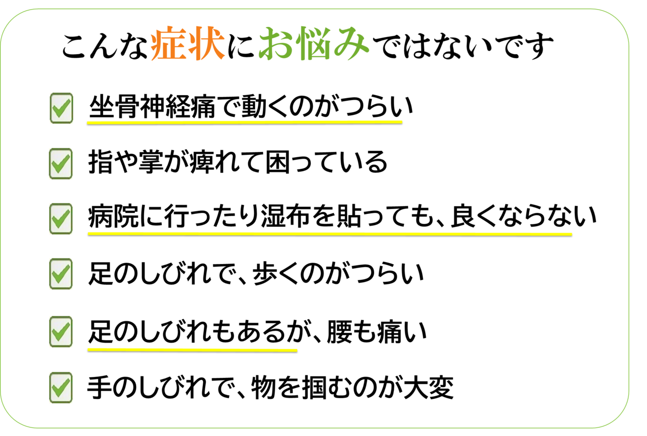 慢性的な腰痛と、ひざの痛みがありましたが、ケアを受けるにしたがって、どんどん痛みが少なくなり、とても嬉しかったです。今でも、仕事で使い過ぎると痛みが出そうになった時はすぐにお世話になりに行きます。